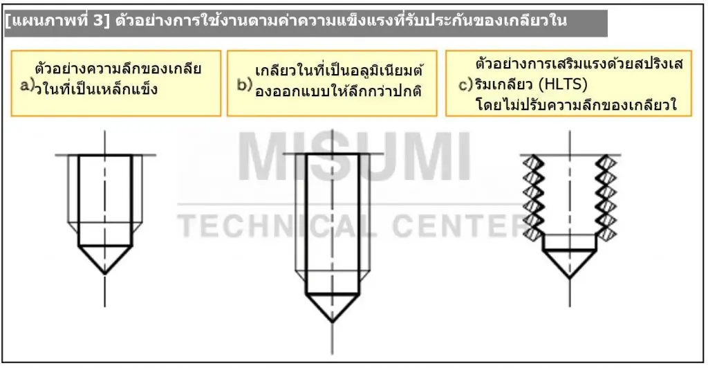 - สำหรับวัสดุที่มีค่าความแข็งแรงต่ำ (เช่น อลูมิเนียม ฯลฯ) ต้องออกแบบเกลียวในให้ลึกเพื่อเพิ่มความแข็งแรงบริเวณเกลียวของด้านเกลียวใน