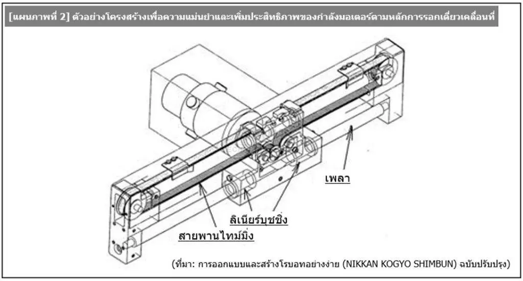 | 4. | แม้จะใช้เพลาเพียง 1 ชิ้นก็สามารถควบคุมการหมุนของลิเนียร์บุชชิ่ง ได้โดยการติดตั้งสายพานไทม์มิ่งกับเพลาให้ขนานกันแบบบนล่าง |