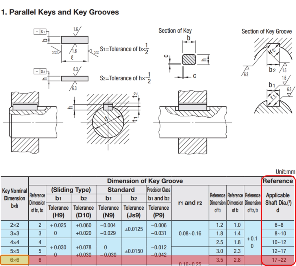 ขนาดของเพลาถือเป็นข้อมูลพื้นฐานที่ต้องนำมาพิจารณา โดยสามารถดูได้จากตารางนี้ ให้เพื่อนๆ สังเกตุที่คอลัมน์ (Applicable Shaft Dia.) ในกรอบสีแดง ก็จะได้ขนาดของลิ่มที่เหมาะสมสำหรับเพลานั้นๆ ตัวอย่างเช่น เพลาขนาด 18 mm. ขนาดของลิ่มส่งกำลังที่เหมาะสม คือ 6×6 mm. ในกรอบสีเหลือง โดยในการเลือกขนาดของเพลาและลิ่มส่งกำลังนั้นจะอิงจากมาตรฐาน JIS โดยเพื่อน สามารถดูตารางขนาดของลิ่มส่งกำลังเพิ่มเติมได้ที่นี่