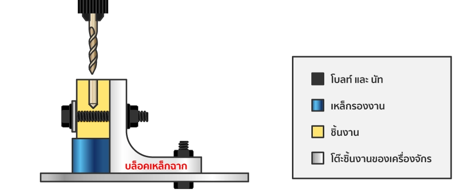 - ควรยึดบล็อคเหล็กฉาก ให้แน่นหนากับพื้นโต๊ะเครื่องจักรกล