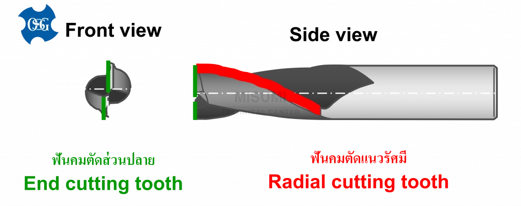 - ร่องคายเศษ (Flute): มีไว้สำหรับคายเศษที่เกิดจากกระบวนการขึ้นรูป ตัวอย่าง เช่น 2 ร่อง, 3 ร่อง, 4 ร่อง เป็นต้น