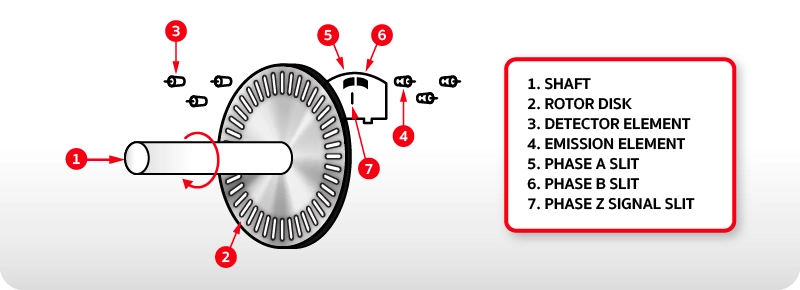 หลักการทำงานของ Incremental Rotary Encoder : ทำงานโดยใช้ดิสก์ที่มีช่องสลิต (Slit) สำหรับ Phase A, Phase B และ Phase Z ซึ่งยึดติดกับเพลา โดยเมื่อเพลาหมุน แหล่งกำเนิดแสง (Emission element) จะส่งแสงผ่านสลิต ซึ่งตัวรับแสง (Detector element) จะเปลี่ยนเป็นสัญญาณดิจิทัล (High/Low)